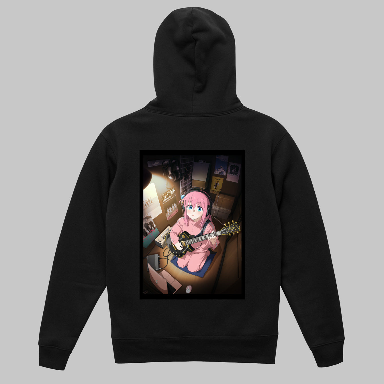 バックには、後藤ひとりが押し入れで宅録している様子を描いた描き下ろしイラストが最大サイズでプリントされており、臨場感たっぷりの作中の世界観が楽しめます。フロントの胸元にはギター・マガジンとアニメ『ぼっち・ざ・ろっく!』のロゴがさりげなくあしらわれ、特別コラボレーションにふさわしいアイテムに。後藤ひとりにようにジャージっぽく着用してみるのもいいですね!