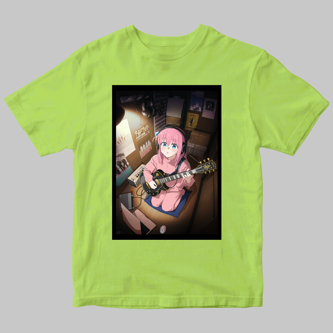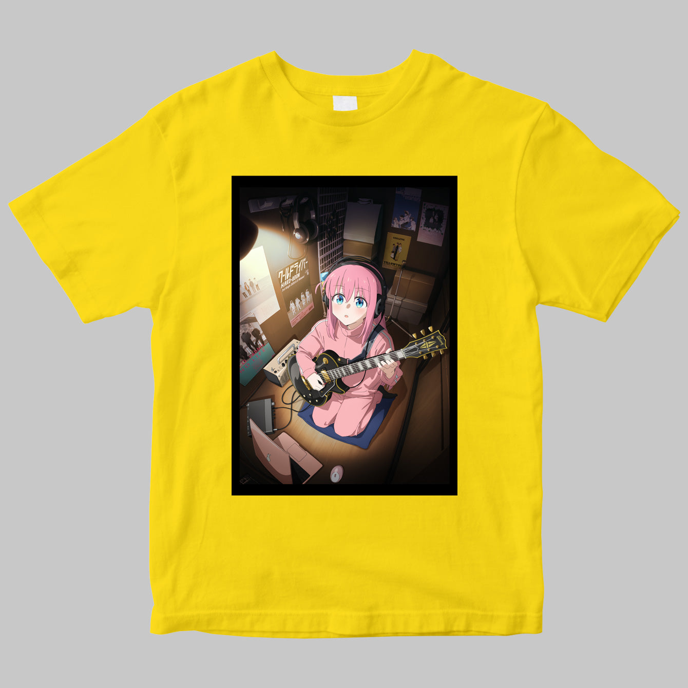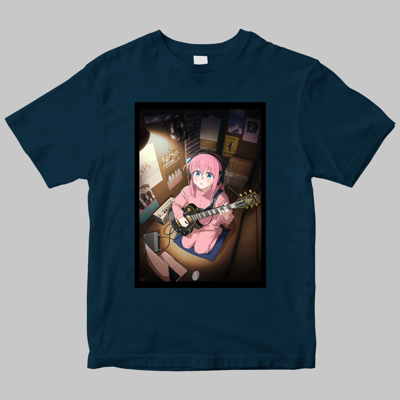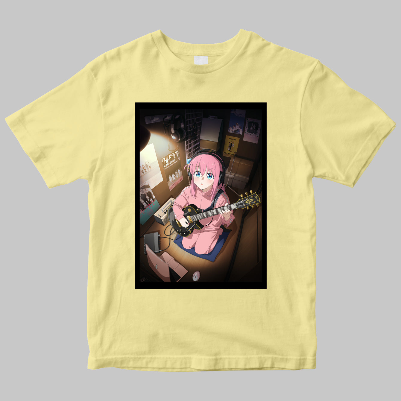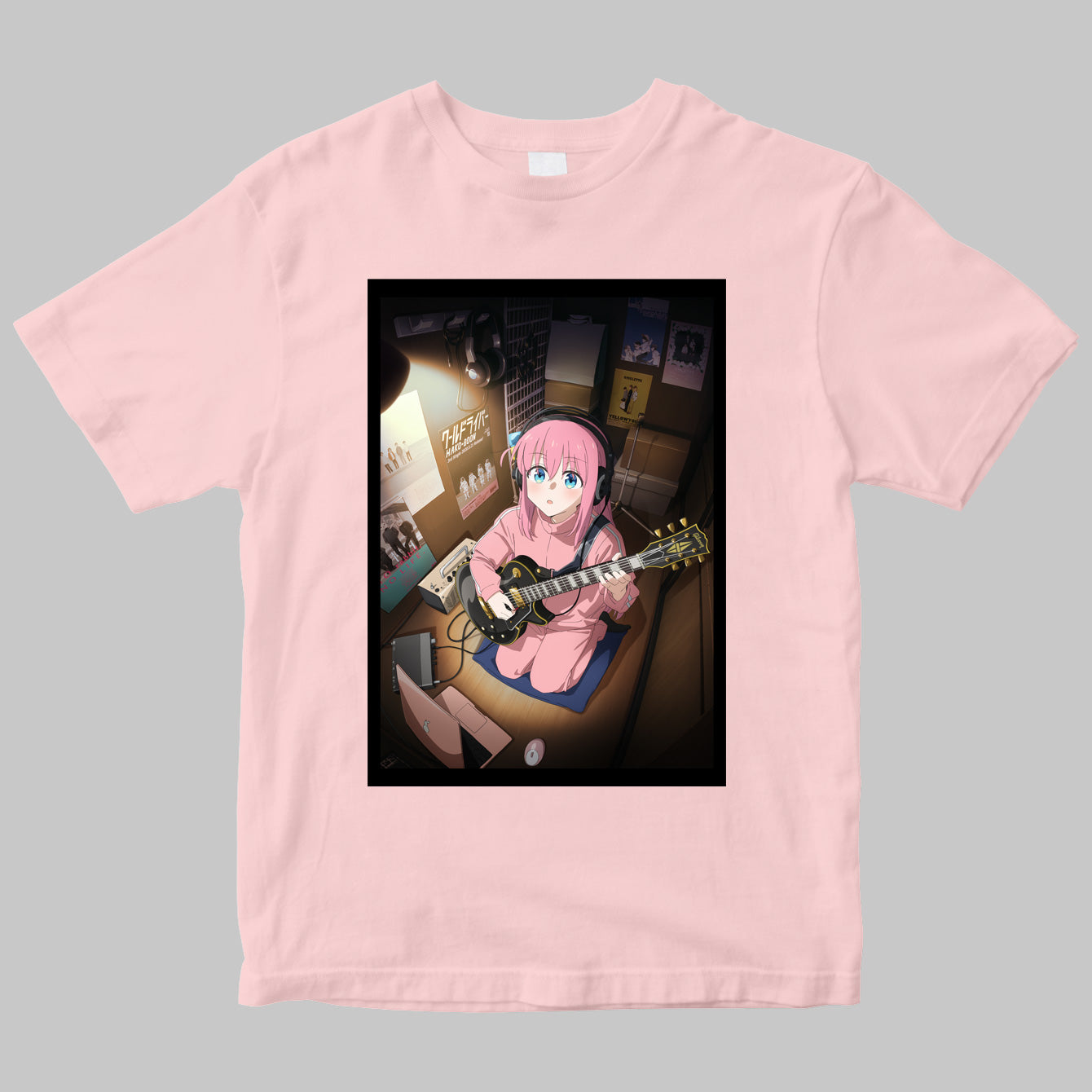 Tシャツのフロントには、後藤ひとりが押し入れで宅録している様子を描いた描き下ろしイラストが最大サイズでプリントされており、臨場感たっぷりの作中の世界観が楽しめます。バックにはギター・マガジンとアニメ『ぼっち・ざ・ろっく!』のロゴがあしらわれていて、特別コラボレーションにふさわしいアイテムに仕上がっています。このTシャツを着て、下北沢の街を練り歩いてみるのもいいですね!