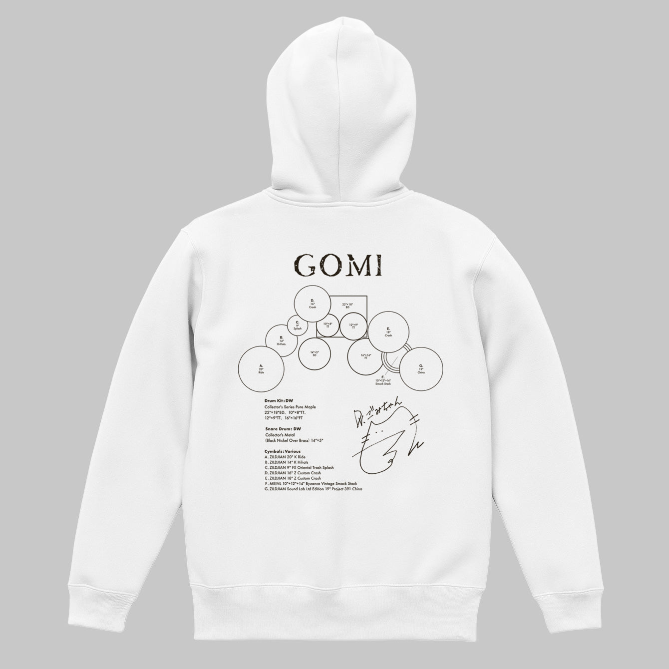 2タム1フロア・タムという王道のロック・セッティングながら、奏者左側に配置されたライド・シンバルやスネアとハイハットの距離感は、左利き故のオープン・ハンド奏法を駆使するGOMIならではのセッティング。彼女のドラム愛が詰まったセット図フーディは、ファン必見です!
