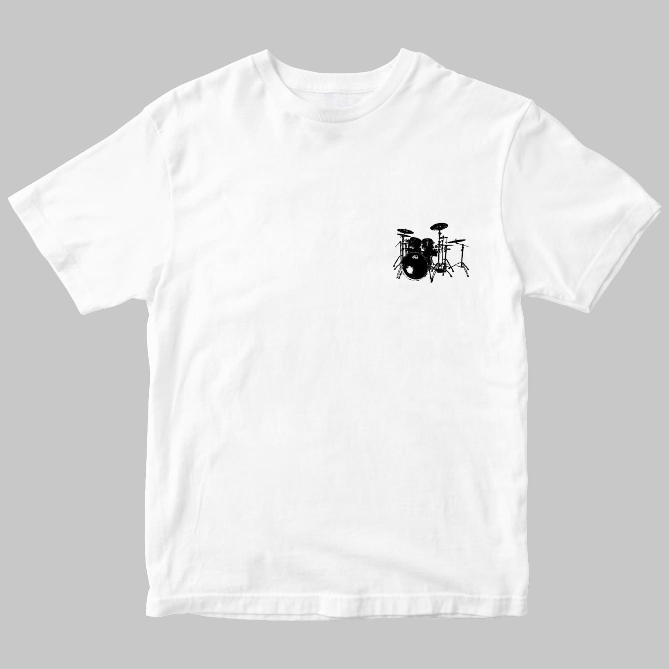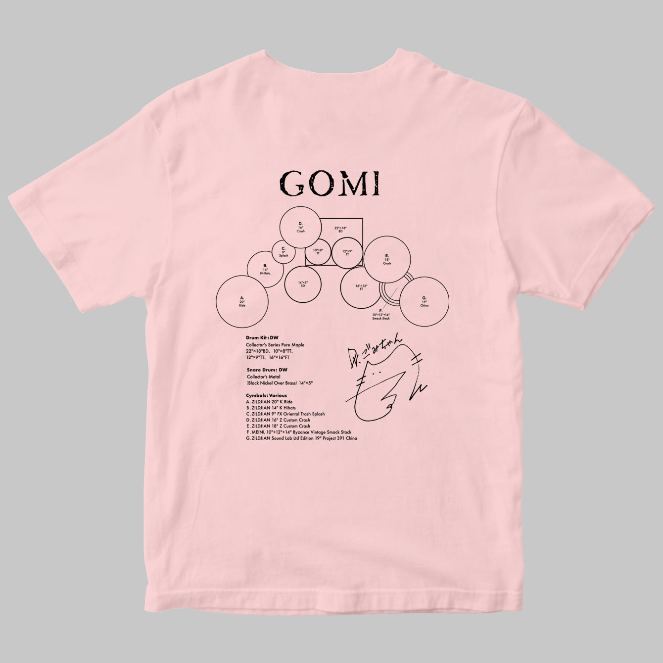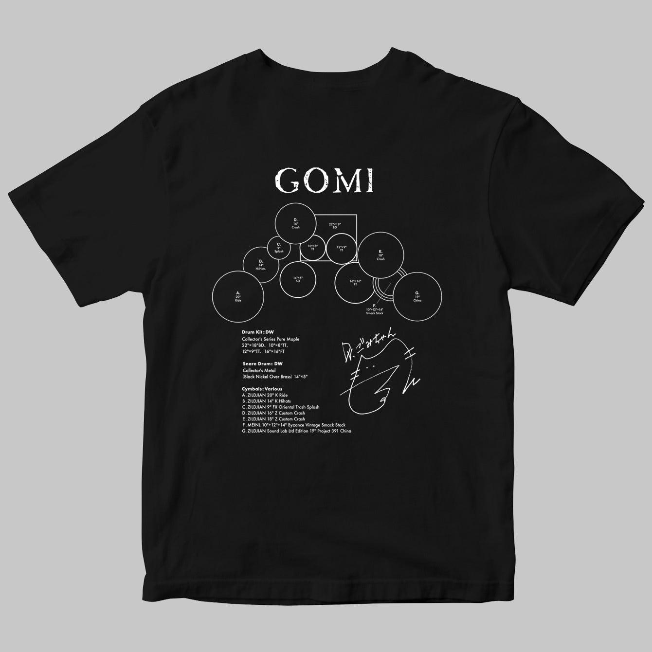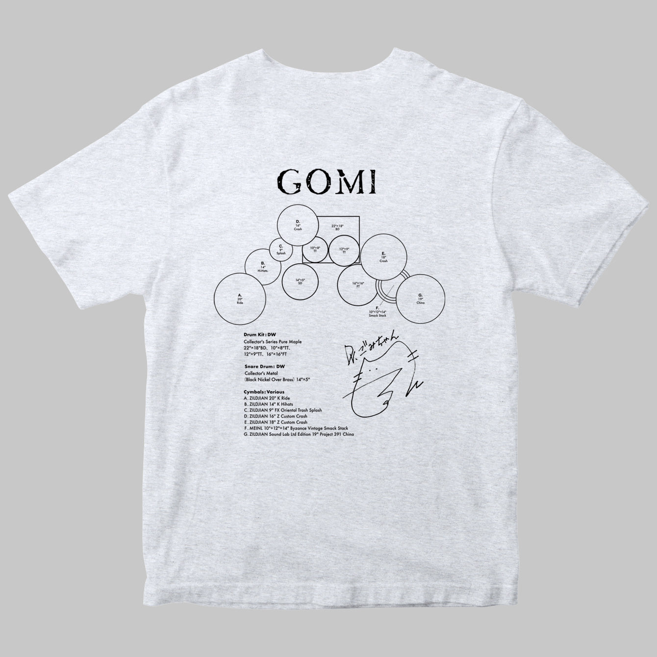 2タム1フロア・タムという王道のロック・セッティングながら、奏者左側に配置されたライド・シンバルやスネアとハイハットの距離感は、左利き故のオープン・ハンド奏法を駆使するGOMIならではのセッティング。彼女のドラム愛が詰まったセット図Tシャツは、ファン必見です!