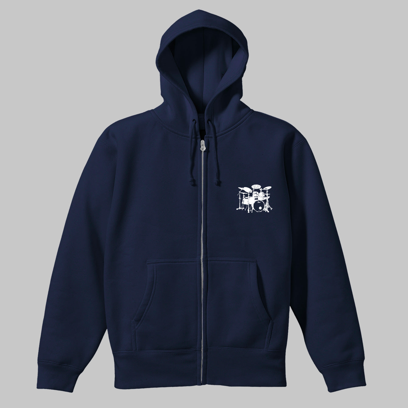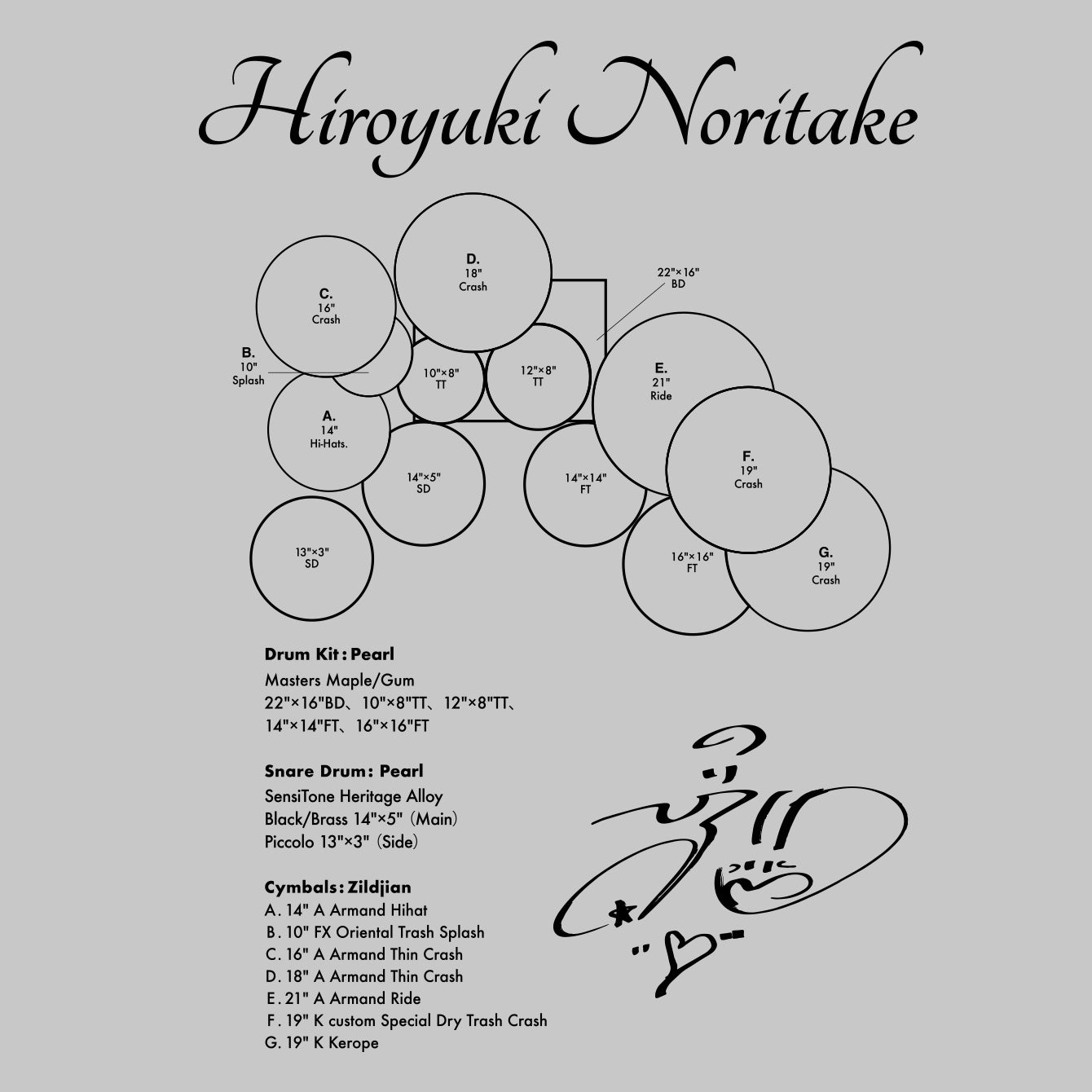 同じ構成のMasters Maple/Gumを2台持っている則竹だが、今回のセット図フーディのデザインに落とし込んだのは、主にフュージョンの現場で活躍しているという、ラックで組み上げた2タム2フロア・タムのセッティング。音との向き合い方、そしてセッティングとの向き合い方、日々進化/深化し続ける則竹の美学が詰まったこだわりのセットを堪能してほしい。